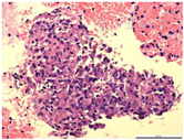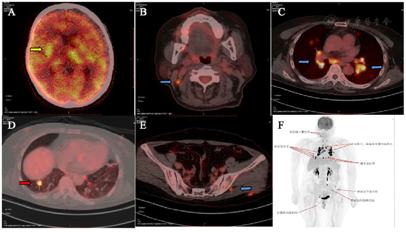 脑磁共振成像(MRI)显示双侧大脑半球、右丘脑、右颞下叶多发病变(图1A)。胸部CT图像显示纵隔和双肺门淋巴结肿大并伴有多个肺结节(图2A)。18f -氟脱氧葡萄糖(FDG)正电子发射断层扫描(PET/CT)显示右上颈部深淋巴结、门部、纵隔、多发肺结节、双侧髋关节肌间隙、左髋关节皮下软组织明显摄取FDG(图3)。超声(US)引导下左髋关节皮下软组织活检显示大量嗜酸性粒细胞及纤维血管增生,无法提供诊断线索。然后我们在局部麻醉下对纵膈淋巴结进行WANG™经支气管抽吸针。然而,标本中仅发现少量纤毛柱状上皮细胞,诊断仍不明确。最后在全身麻醉下行支气管超声引导下经支气管针抽吸(EBUS-TBNA)纵隔淋巴结,发现慢性肉芽肿性炎症,提示结节病诊断(图4)。