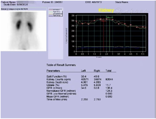 2020年6月30日肾核素显像ECT组套(肾动态+肾小球滤过率)。检查所见:患者床边弹丸式静脉注射药物后即行肾小球滤过率测定,经计算机处理,结果如下:左肾肾小球滤过率=54.6 ml/min,右肾肾小球滤过率=53.8 ml/min,双肾总肾小球滤过率=108.4 ml/min。双肾总肾小球滤过率本院正常参考值:105±25 ml/min(图3)。