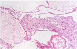 患者于2020年7月3日行手术治疗,2020年7月8日术后病理:肉眼所见:(右肾右肾肿物)灰褐色组织大小4.0 cm×3.0 cm×1.5 cm,剖开见一囊腔,囊腔内容物流失,囊腔大小2.7 cm×2.5 cm×1.5 cm,囊腔周围附少许肾组织。病理诊断:部分肾脏切除标本,肾细胞癌伴显著囊性变,待免疫组化检查补充报告(图4)。