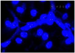基因检测:采用TFE3断裂探针:镜下见肿瘤细胞内为一黄一红一绿信号,提示TFE3基因断裂重组(图8)。