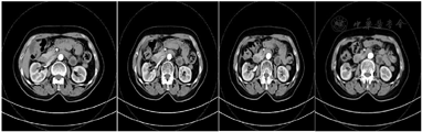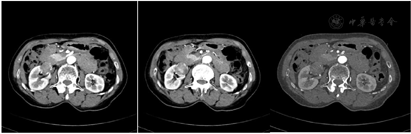2020年10月15日泌尿科门诊多排CT中腹部直接增强(欧乃派克),CT所见:右肾恶性肿瘤术后:右肾形态不整,右肾术区结构紊乱并示缝合线及短棒状密度影,临近结构强化不均,右侧外侧示条索影;左肾形态及强化未见异常。双侧肾上腺未见明显异常(图10)。