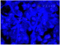 基因检测(FISH检测):采用TFE3断裂探针:镜下见肿瘤细胞内为一黄一红一绿信号,提示TFE3基因断裂重组(图5)。