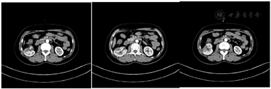 病例1,患者女性,50岁,主诉为"B超发现右肾占位5 d"。患者9 d前出现四肢乏力,于当地医院就诊,查血压160/100 mmHg(1 mmHg=0.133 kPa),予口服倍他乐克及针灸治疗后,症状缓解。5 d前至南京医科大学第一附属医院心内科门诊就诊,查B超:右肾下极皮质见一囊实性混合回声。查超声造影考虑囊性癌可能。随后至南京医科大学第一附属医院泌尿外科门诊就诊,查CT:右肾中下极偏腹侧软组织肿块,建议增强CT/MRI检查。现为求进一步治疗,患者于2020年6月28日收住入院。病程中无尿频、尿急、尿痛、排尿困难,无咳嗽咳痰,无胸痛,无黄疸,无腹泻、腹胀,无进行性消瘦,饮食、睡眠良好,大小便正常。