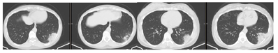 此时,与其共同居住的例2(儿媳)和例3(孙女)也出现发热,体温最高38.6℃,例2还伴有明显头痛,血象不高,流感检测阴性,胸部CT也显示左肺下叶外后基底段胸膜下片状实变影(图2)。