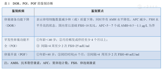该疾病与卵巢储备功能下降(DOR)、早发性卵巢功能不全(POI)、卵巢早衰(POF)的鉴别诊断见表1。