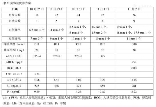 考虑女方高龄与胚胎染色体异常导致的妊娠丢失相关。该患者要求行PGT-A助孕,反复向其交代卵巢储备功能减退,可致获卵数减少,无囊胚形成或无可移植胚胎可能。患者表示理解,坚决要求进入周期。考虑患者卵巢功能较差,恰该周期黄体期卵泡数量多于月经期水平,故选择黄体期促排方案。具体促排过程见表2。