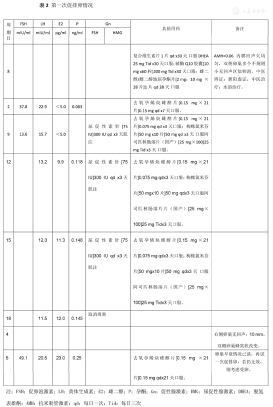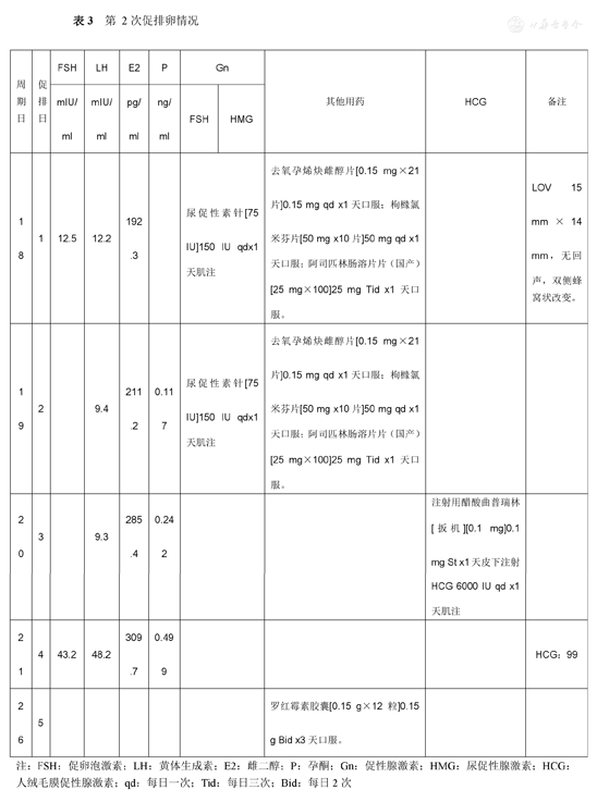 第一周期:促排卵治疗。促排卵前雌激素一周期、口服避孕药(OC)一周期预处理,以降低内源性促卵泡生成素(FSH)水平。促排卵方案为OC半片+克罗米芬(CC)50 mg+Gn 300 U。Gn第9天卵巢无反应,遂取消周期。具体见表2。
