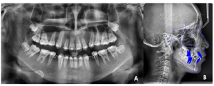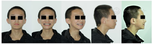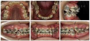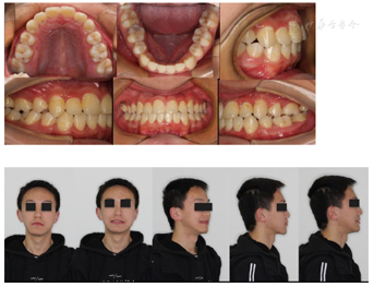 患者正畸治疗过程中,侧貌凸,正貌左右不对称;4颗第一前磨牙已拔除,拔牙间隙未完全关闭,上下牙列未排齐,覆合、覆盖偏大。