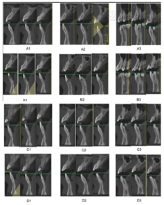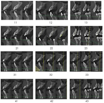 曲面断层片检查(图3A):14、24、34、44缺失,全口牙牙根平行度欠佳,散在间隙,18、28、38、48牙胚存;12根尖暗影;12、22、41、42、31、32牙根短且根尖圆钝;11、12、21、22、41、42、33、41、32、33牙槽骨有不同程度的水平吸收。
