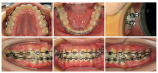 2.正畸治疗第1-6月,逐步使用0.014英寸、0.016英寸、0.018*25英寸镍钛丝排齐牙列,每4-6周复诊并适度调合并加少量双颌摇椅曲,密切观察咬合干扰、牙齿松动度、牙根形态,前牙的覆合关系等(图6)。