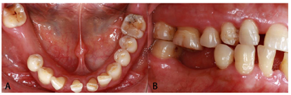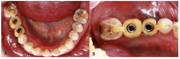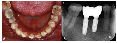 面观;B:颊面观术后6个月后随访,修复体稳定,黏膜未见红肿退缩,X线片牙槽嵴顶边缘骨未见明显吸收(图24)。
