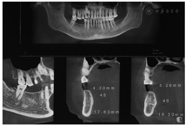 面照;B:颊面照CBCT检查:45牙缺牙区牙槽嵴顶宽度4.30 mm,高度17.63 mm;46牙缺牙区牙槽嵴顶宽度5.26 mm,高度16.20 mm(图2)。