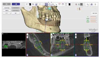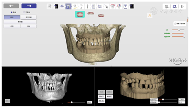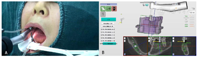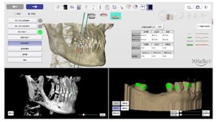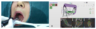 自主式口腔种植机器人系统能够在医生的监控下,根据指令自主地完成口腔种植的主要手术操作,并可以融合感知到的视觉信息与力觉信息对手术操作精度进行判断,实时发出指令进行调整,以保证实现精准、微创、安全的手术效果。为了机器人更好的完成种植手术,该款系统还配备了一款强大的软件系统DentalNavi(雅客智慧,中国)。同时该系统还制定了详细的安全策略,例如:主动吸唾装置、坐姿种植、随动功能以及安全急停设计等。前期机器人临床种植病例显示种植精度约为0.3 mm。这位患者计划在缺牙区植入2枚植体,术后使用扫描杆进行精度评估。