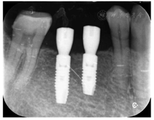 种植义齿修复45、46缺失牙。45牙缺牙区植入1枚4.0 mm×11.0 mm柱型植体,46牙缺牙区植入1枚5.0 mm×11.0 mm柱型植体(Astra TX,Dentsply Sirona,美国)。
