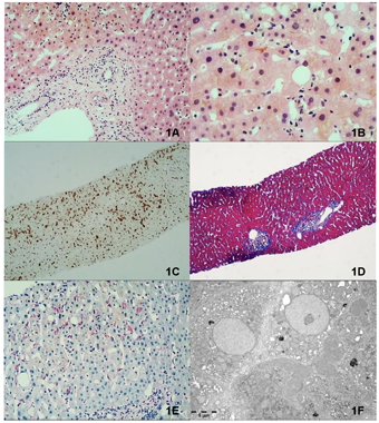 诊断:患者中老年男性,有服用中药史,此次因黄疸就诊,肝功能示ALT、AST、GGT、ALP、T-BIL升高;肝脏病理学检查结果提示:淤胆性肝炎、中度淤胆、轻度活动性炎症,符合药物性肝损伤,Scheuer评分:G2S2(图1)。临床分型:胆汁淤积型;RUCAM量表:7分;严重程度分级:3级(重度肝损伤)。故诊断为:重度药物性肝损伤,胆汁淤积型。