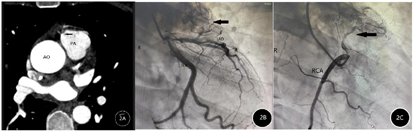 Shunsuke Sakamoto等[4]报道了一例中年男性患者,造影显示长约1.5 cm冠状动脉瘤和冠状动脉-肺动脉瘘(CPAF)自发破裂,手术将该患者破裂的动脉瘤切除并安全闭合CPAF。因此,对于早期诊断和治疗有症状的CAF可以改善预后,甚至降低心源性猝死的风险。