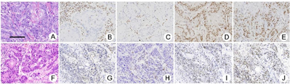 病例1:A.皮肤鳞状细胞癌HE染色;B. MSH2表达阴性;C. MSH6表达阴性;D. MLH1表达阳性;E. PMS2表达阳性。病例2:F.阴茎鳞状细胞癌HE染色;G. MSH2表达阴性;H. MSH6表达阴性;I. MLH1表达阳性;J. PMS2表达阳性。标尺长度为100 μm