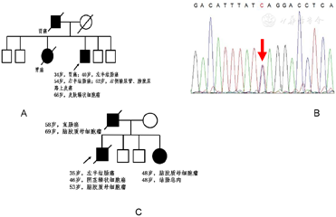 病例1,先证者为男性,66岁,发现背部肿物1个月余入院。肿瘤史:患者34岁患胃癌,40岁患左半结肠癌,54岁患右半结肠癌,62岁患右侧输尿管尿路上皮癌和膀胱尿路上皮癌,均予以手术切除。家族史:患者父亲和姐姐均患胃癌去世。病例2,先证者为男性,46岁,发现阴茎肿物而入院。肿瘤史:患者39岁患右半结肠腺癌,已手术切除,53岁患脑胶质母细胞瘤,54岁时死于脑胶质母细胞瘤复发。家族史:患者父亲曾患结肠癌和脑胶质母细胞瘤,已去世;患者妹妹48岁时患脑胶质母细胞瘤;一弟弟患结肠息肉;另一弟弟未见异常。