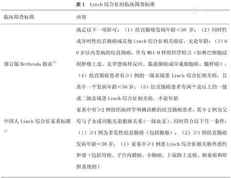 | 修订版Bethesda指南[5] | 满足以下一项即可:(1)结直肠癌发病年龄<50岁;(2)同时性或异时性结直肠癌或其他Lynch综合征相关癌症,无论年龄;(3)60岁以内发病的结直肠癌,伴有MSI-H样组织学特点(如淋巴细胞浸润肿瘤上皮、克罗恩病样反应、黏液腺癌或印戒细胞癌、髓样癌);(4)结直肠癌患者有≥1例的一级亲属患Lynch综合征相关癌,且其中一个发病年龄<50岁;(5)结直肠癌患者有两个及以上的一级或二级亲属患Lynch综合征相关癌,不论年龄 |