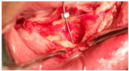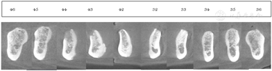 (4)下颌拔牙后4个月(2016年1月)复诊,口腔CBCT检查43、44区骨组织早期愈合(图7),牙槽嵴顶黏膜愈合良好(图8A),口腔局部阿替卡因肾上腺素注射液浸润麻醉,32、42区轴向植入Nobel Speedy4 mm×13 mm种植体,35区斜行植入Nobel Speedy4 mm×15 mm种植体,43、44区骨组织愈合不良,清理肉芽组织后呈凹坑型骨缺损(图8B),45区倾斜备洞穿越44、43骨缺损区植入Nobel Speedy4 mm×18 mm种植体(图8C),4颗种植体初期稳定性均达到35 N·cm,安装复合基台。43、44骨缺损区回填自体骨屑(图8D),修整牙龈、黏膜瓣复位,4-0可吸收缝线严密缝合创口。术后即刻制取印模,制作下颌种植固定过渡义齿并戴入,义齿修复到第二前磨牙,建立上下颌固定义齿咬合关系。(图9)。
