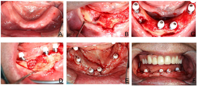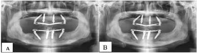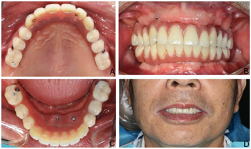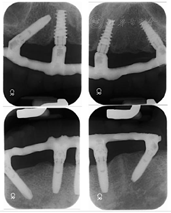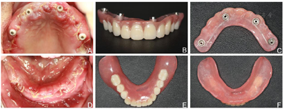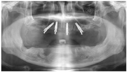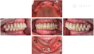 上下颌"All-on-4®"修复治疗方案,拔除余留牙后上颌植入4枚种植体行即刻种植固定义齿即刻修复,下颌因骨条件不良,可摘总义齿过渡修复4个月后,植入4枚种植体即刻固定义齿修复,6个月后上下颌完成种植固定终义齿修复。