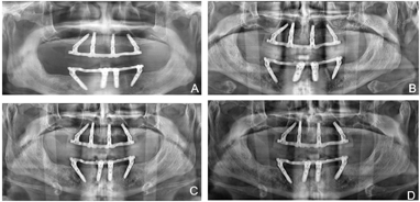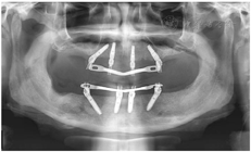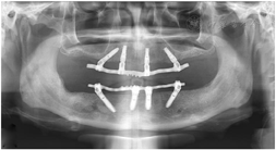 (5)术后复查:术后1个月、5个月复诊,上下颌过渡义齿咀嚼功能较戴用可摘义齿明显改善,面型及发音正常。X线全颌曲面体层片显示种植体骨结合良好(图10)。