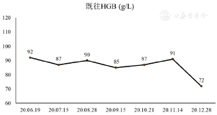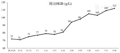 一般治疗方面,给予吸氧、禁饮禁食、停服降压药、大便OB监测。药物治疗方面,静滴注射用泮托拉唑钠每8 h一次抑酸护胃,静滴葡萄糖氯化钠注射液联合氨基酸注射液补充能量及营养,另予无肝素透析1次。患者自2020年9月15日起规律使用rHuEPO3000 U一周两次静脉注射。1个月前随访血红蛋白91 g/L(图1),入院复查血红蛋白72 g/L,rHuEPO加量至3000 U每周3次静脉注射。4 d后(2021年1月2日)未见出血证据,复查HGB 75g/L(图2),脉搏89次/min,血压157/75 mmHg,逐渐从流质饮食过渡到半流质饮食,并加用多糖铁复合物胶囊150 mg每日1次,硝苯地平控释片30 mg/每日1次,富马酸比索洛尔片2.5 mg/每日1次,醋酸钙片1.334 g每日3次随餐。半个月后(1月17日)患者无明显心累乏力,大便成形,大便OB阳性,复查HGB 78 g/L(图2),予以出院。