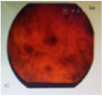 患者于2020年3月10日因"发热伴双眼肿痛2 d"再次入住我科,入院2 d前无明显诱因下出现发热,体温高达39.3℃,伴双眼肿痛流泪,左眼肿痛较重,伴失明。入院查血常规示WBC 57.83×109/L,MONO 11.65×109/L,RBC 3.87×109/L,HB 64 g/L,HCT 0.334,PLT 345×109/L,CRP:85.22 mg/L。C反应蛋白凝血系列未见明显异常。心脏超声示无明显积液。阳性体征:双眼结膜充血,脾肋下可触及。眼科会诊后完善眼底镜等相关检查诊断虹膜睫状体炎,双眼眼底出血(图3)。眼底分泌物进行镜检发现有大量单核细胞,考虑CMML肿瘤细胞浸润可能,遵眼科医嘱消炎对症治疗,2020年3月15日再次行阿扎胞苷100 mg qd d1~7去甲基化治疗后复查视力明显好转后出院。