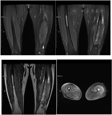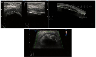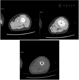 入院前查下肢彩超示:左股骨中下段骨皮质浅方实性占位。入院后查左股骨全长正侧位片示:左股骨中段骨质密度稍显减低,骨皮质毛糙、变薄,周围软组织肿胀,关节对应关系良好。查肌骨超声所见图1:左侧股骨中下段骨长轴纵切面骨皮质局部骨膜增厚,不规则隆起,可探及范围约157 mm×17 mm混合回声区,后方回声减低,交界处的骨膜回声增强、增厚、抬高呈"Codman"三角征;围绕骨干横切面见"轮辐样"放射状分布的针状强回声,回声与骨皮质表面垂直;彩超多普勒血流显像(color Doppler flow imaging,CDFI):内可探及星点状血流信号;后方骨皮质尚连续,中下段边缘毛糙。进一步查左股骨中下段增强CT所见图2:左股骨中下段髓腔内见纵形软组织密度影,邻近骨皮质稍增厚且骨质密度减低,呈筛孔样骨质破坏,周围可见放射状骨膜反应及软组织肿块,骨干未见明显膨胀,增强扫描后髓腔内见穿行血管影,周围软组织肿块中度强化。查左股骨中下段核磁见图3:左股骨干中下段髓腔内条带状长T1、压脂长T2信号影,骨皮质厚薄不均,信号欠连续,压脂信号增高,骨干周围包绕软组织块,呈略短T1、压脂长T2信号影,压脂T2其内见多发细线样低信号影垂直于骨皮质分布,病变与周围软组织区界限不清,软组织内片状长T1、压脂长T2信号影;扫描所示左股骨干远端小圆形、右股骨干中段髓腔内条带状长1、压脂长T2信号影,境界较清晰,邻近骨皮质未见明确异常。查胸部CT见图4:双肺纹理增重,双肺见多发大小不等结节样高密度影,较大者边缘欠光整,呈浅分叶状,左肺下叶见索条影,纵隔内见多发小淋巴结影;肝右叶内见类圆形低密度影,边缘可见模糊稍高密度影。腹部超声所见:肝脏实质回声致密,内可见多个低回声区,较大者大小约20 mm×14 mm的肿物;脂肪肝。查腹部ECT见肝右叶上述改变外,未见其他异常。实验室化验肿瘤标志物CEA、AFP、CA-199等都在正常范围;C反应蛋白11.43 mg/L(参考范围0.00~0.60 mg/L,以下同);碱性磷酸酶183 U/L(40~150 U/L);磷酸肌酸激酶同工酶110 U/L(1~24 U/L)。