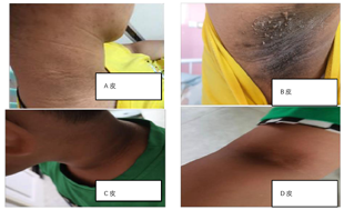 体格检查:呼吸频率40次/min,脉搏120次/min,体质量62 kg,身高165 cm,血压150/110 mmHg,体质指数23.9 kg/m2。神志清,精神差,智力发育正常,呼吸促,颈部、腋下、肘窝处可见皮肤颜色变深,呈灰黑色,皮肤增厚伴有乳突状赘生物。眼睑无浮肿,双肺呼吸音清,心音低钝,律齐,心率120次/min,心前区各瓣膜听诊区无杂音。腹软,肝肋下3 cm,脾未触及肿大,移动性浊音阴性,双下肢轻微浮肿,无多指/趾畸形。