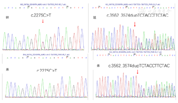 ②c.3562_3574dupTCTACCTTCTACT,p.S1192Ffs*21,移码突变,杂合,致病性变异。根据ACMG指南,该变异判定为致病性变异(Pathogenic)PVS1+PVS2 Supporting+PM3(Trans):PVS1该变异为零效变异(移码突变),可能导致基因功能丧失;PM2 Supporting在正常人群数据库中频率为-;PM3(Trans)隐性遗传病,与另一个致病疑似致病变异反式存在(与另一个致病疑似致病突变组成复合杂合)。文献数据库未有该位点相关性报道,ClinVar数据库无该位点致病性分析结果。家系分析,先证者父亲该位点无变异,先证者母亲该位点杂合变异(图4),先证者弟弟该位点杂合变异。