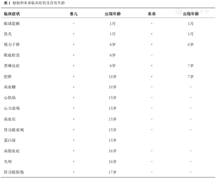 患儿出生后出现眼球震颤、畏光,随着年龄增长逐渐出现黑棘皮症、肥胖、失明、听力下降、心力衰竭、肾功能衰竭、高血压和肝功能损伤。患儿弟弟7岁,出生后亦逐渐出现眼球震颤、畏光、视力减退和黑棘皮症。