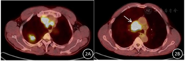 患者中年男性,慢性病程,主要表现为咳嗽、咳痰、咯血,查体右锁骨上可触及多个肿大淋巴结,质硬,固定,长期大量吸烟史,proGRP、NSE、CEA明显升高,胸部CT示右肺上叶不规则团块影,边缘分叶,多发毛刺,纵隔及右侧肺门可见多发肿大淋巴结。根据左肺下叶背段支气管黏膜活检为鳞状细胞癌,右肺上叶肺活检为肺腺癌,颈部淋巴结活检为小细胞肺癌。故本例患者肺癌诊断明确,为同时性多原发肺癌。鳞癌是在气管镜下发现,为早期阶段。腺癌的体积比较大,小细胞肺癌原发灶考虑为右侧肺门附近,如图1C、图1D、图2B中白色箭头所示,锁骨上淋巴结穿刺病理证实为小细胞肺癌转移,故在肿瘤标志物上proGRP、CEA明显升高,SCC正常,也符合其临床情况,最终分期:cT2N3M1c,Ⅳb期。