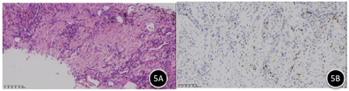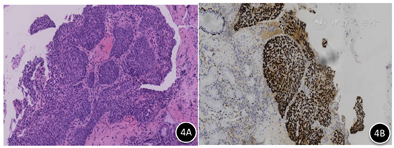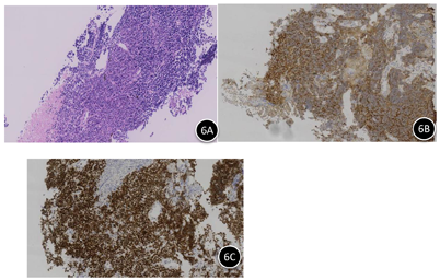右侧颈部Ⅳ区淋巴结穿刺活检:可见低分化癌伴大片坏死,结合免疫组化考虑小细胞肺癌,不除外小细胞-非小细胞混合分化的癌,目前该穿刺组织中仅见小细胞癌成分。免疫组化示:TTF-1(弥漫强+),NapsinA(-),CK7(+),P40(-),CK5/6(-),CgA(弱+),CD56(+),Syn(+),Ki-67(90%)。