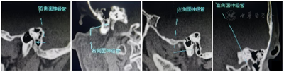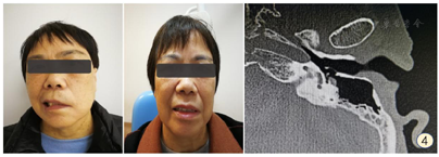 患者术后一般状态良好,诉睡眠可闭眼,伸舌可自行调整居中,听力无明显改变。术后第7天出院。分别于术后第3个月、6个月、1年、2年、3年随访,影像学检查术后乳突CT平扫+增强提示术后移植段神经在位,生长良好,未见肿瘤复发。面神经功能H-B Ⅲ级,无听力下降(图4)。
