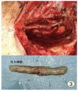 入院完善相应检查、检验,给予以营养神经、扩血管药物及激素等对症治疗。于4月19日在全麻下行"左侧面神经鞘瘤切除术+耳大神经移植术"。患者取平卧位,常规经口插管全麻成功后,术区常规消毒铺巾。按筛区径路,用切割钻行乳突轮廓化,暴露面神经垂直段,其面神经垂直段中部膨胀,并向周围组织侵犯,继续向上向前暴露面神经水平段,向下暴露垂直段直至茎突孔。探查病变部位见肿瘤位于垂直段中部,呈"纺锤状"约1.0 cm×0.7 cm大小,钝性剥离肿瘤,距肿瘤上下端0.2 cm安全缘处切除肿瘤,切除之肿瘤包膜完整,并切除面神经上下两断端部分组织做术中冰冻病理检查。术中病理报告为神经鞘膜瘤,安全缘阴性。于左侧取耳大神经约2.5 cm,在显微镜下修剪,并沿骨槽植于面神经两断端间,并行端-端吻合,局部放置明胶海绵,逐层缝合切口,外用敷料加压包扎,外耳道内填塞碘仿纱条(图3)。术后予以抗炎、补液、局部换药等对症治疗,术后第5天患者伸舌可自行调整居中。术后第6天听力初测正常,拆线换药见切口愈合可。外耳道填塞物已取出,外耳道通畅,未见明显血性分泌物。