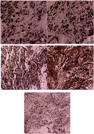 MMNST镜下边界清楚但无包膜,由梭形细胞至上皮样细胞组成,呈束状或交织状、巢状排列,胞质内可见色素性颗粒,色素多的时候可将核掩盖;通常无Verocay小体、微囊、厚壁血管等普通型神经鞘瘤常见的组织学特征。部分细胞胞质内可见空泡,类似成熟脂肪细胞;瘤细胞核圆形、卵圆形或伸展,染色质细腻,可见小核仁,核分裂罕见。MMNST的免疫组织化学染色结果在不同病例报道中不尽相同,但多数病理S-100,HMB-45呈阳性。但也有研究提示,MMNST和黑色素瘤都可以表达S-100和其他黑色素细胞标志物,网状蛋白染色在区分MMNST和黑色素瘤方面有重要意义,在MMNST中,有丰富的网织蛋白网包绕着每个单独的肿瘤细胞,而在黑色素瘤,巢状或更大规模的肿瘤细胞被网织蛋白纤维包绕[8]。