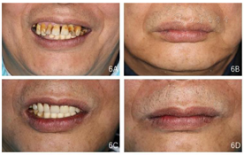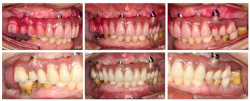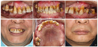 面照;F:正面照口内检查:15、16、24、25、26、27缺失,缺牙区牙槽嵴低、窄;14、12、11、21、22Ⅲ度松动、17Ⅱ度松动、18Ⅰ度松动,牙龈退缩,部分牙根暴露,前牙呈扇形分开,高笑线。31、32、41、42缺失,已行31、32、33、41、43烤瓷固定桥义齿修复(5单位);36缺失,37近中倾斜,近中邻面及远中邻