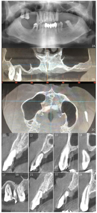 影像学检查:曲面体层片及CT检查显示11、21牙槽骨吸收至根尖1/3;12、14、17、22牙槽骨吸收超出根尖,12、22根尖圆形低密度影像,17根尖周低密度影像;18、13、23、35、45、46牙槽骨吸收至根长2/3;37近中及远中邻面可见低密度透射影像,近髓(图2)。
