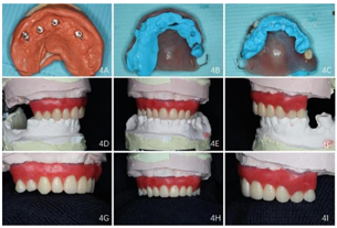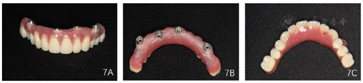 All-on-4®即刻种植即刻负重后口腔卫生与维护十分重要。因此无论是临时固定义齿还是终义齿,均将义齿组织面与牙龈间设计为"端对端"的凸面接触(图7B),此种接触关系更有利于患者进行口腔卫生的维护,减少食物残渣滞留,避免种植体周围软组织炎症发生[20]。按照种植体支持式全牙列固定义齿复诊与维护指南[21]对患者进行每3个月随访,口腔卫生指导包括牙间隙刷、冲牙器、牙线及超级牙线的使用指导,菌斑检查与控制(图12D、E、F、H、I),嘱咐患者戒烟或减少吸烟量,文献证明良好的菌斑控制可以有效地预防种植体周黏膜炎的发生[22]。