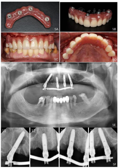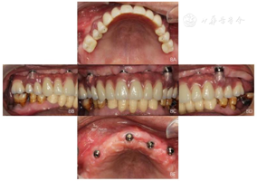 面像;E:佩戴后曲面体层片;F:戴牙后根尖片(3)制作终义齿:种植一期手术6个月后,制作钛支架丙烯酸树脂固定义齿,完成终义齿固定修复。