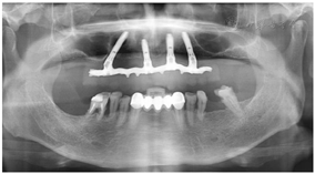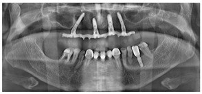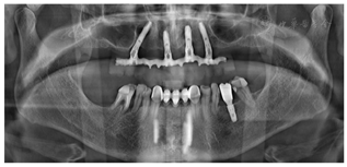 (2)即刻修复:制取上下颌硅橡胶印模,利用术前可摘局部义齿转移颌位关系,制作丙烯酸树脂临时固定义齿,咬合关系恢复至第二前磨牙,调整咬合。口内固定修复螺丝加力至15N.CM,牙龈硅橡胶封闭螺丝孔,拍摄曲面体层片(图4,图5)。
