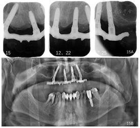 (1)种植一期手术:①阿替卡因肾上腺素注射液局麻下拔除上颌余留牙。②沿16-26区域牙槽嵴顶全层翻瓣,清除拔牙窝内炎性肉芽组织,平整牙槽嵴顶。③分别于12、22、25区定点,逐级备洞,12、22植入Nobel Speedy 4.0 mm×13 mm种植体;25近中倾斜植入Nobel Speedy 4.0 mm×15 mm种植体;④超声骨刀于13、14、15牙槽嵴顶8 mm处行唇、颊侧骨壁近远中向开窗,开窗面积约15 mm×8 mm,剥离上颌窦底黏膜后,15区定点,推开上颌窦底黏膜,近中倾斜备洞直达鼻底,倾斜植入Nobel speedy 4.0×18 mm种植体。⑤4颗种植体初期稳定性均达到35NCm,15颊侧骨开窗区种植体表面覆盖浓缩生长因子(Concentrated growth factor, CGF)(视频4)。⑥拔除18,12旋入RP17°3 mm复合基台,22旋入RP17°4 mm复合基台,15、25分别旋入RP 30°5 mm复合基台,修整牙龈组织,黏膜瓣复位、缝合创口,拍摄曲面体层片(图3)。