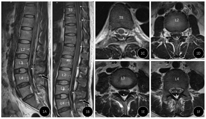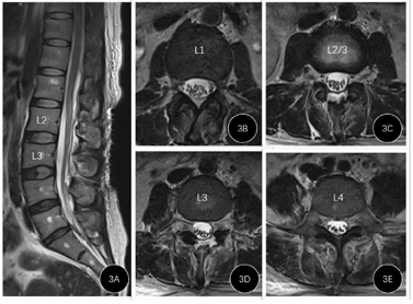 腰椎穿刺术次日诉腰部、右臀部酸痛,体格检查下肢肌力V级,二便正常,穿刺点无渗出,予止痛对症处理。患者腰痛逐渐加重,并逐渐出现大腿疼痛,鞍区麻木感,至穿刺后第7日,患者双下肢肌力Ⅲ级,二便障碍。