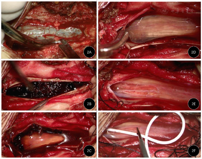 患者椎管内血肿导致马尾综合征,故入院后安排急诊手术治疗。术前停用低分子肝素。手术过程:全麻,患者取俯卧位。常规消毒铺单。C臂透视定位,于腰2~3水平切开皮肤,逐层分离椎旁肌至椎板,磨钻将椎板开槽,将腰2~3椎板连同棘突取下,湿润纱布保存。咬除残余黄韧带,探查见硬膜外无血肿,硬膜呈青色(图2),考虑为硬膜下血肿,切开硬膜可见大量暗红色血凝块,悬吊硬膜,吸除部分血凝块后可见蛛网膜完整,故确诊为硬膜下蛛网膜外血肿。清除腰2~3节段血凝块,并潜行向头端、尾端取出大量血凝块,电凝硬膜内层可疑出血点。考虑到患者血肿节段长,依次切开清除血肿创伤过大,故切开蛛网膜,将血肿与蛛网膜下腔沟通,蛛网膜下腔留置腰大池引流管,以冲洗血肿并引流至体外。水密缝合硬脊膜,仔细止血,复位腰2~3椎板棘突,留置引流管一根,逐层缝合肌肉及皮肤,手术结束。