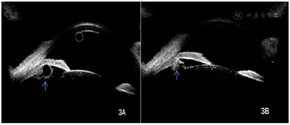 相关文献表明,玻璃体囊肿患者可伴有无虹膜或睫状体囊肿[10],本例患者的诊断即为玻璃体囊肿并伴有睫状体囊肿。原发性的睫状体囊肿多为单眼发病,生长较为缓慢,多见于睫状沟内,通常情况下未见明显的临床症状[11]。既往研究表明,无论是单一的睫状体囊肿还是多发的双侧睫状体囊肿,多为良性改变,但伴随着其不断生长,也容易顶起巩膜根部,从而导致周边前房的深度变浅,使房角粘连范围扩大,从而进一步导致房角的关闭,眼压也随之增高,这种情况和闭角型青光眼有相似之处[12],应及时进行评估,避免误诊或漏诊而延误病情,同时加强患者定期随访尤为重要[13]。