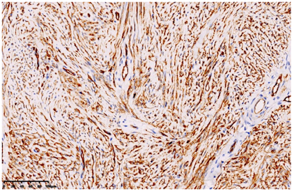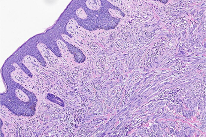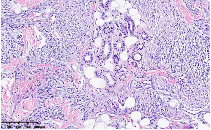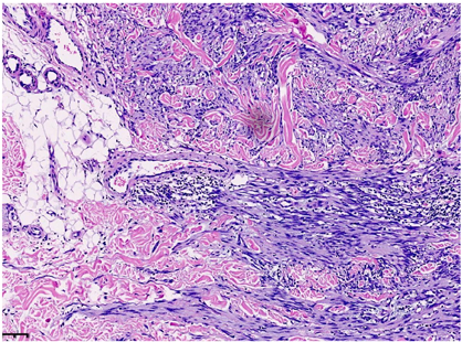 低倍镜下,肿瘤位于真皮层及皮下,肿瘤主要由梭形细胞构成,含有少量卵圆形细胞,部分区细胞丰富,部分区细胞较稀疏,梭形细胞排列成编织状、束状及旋涡状(图1A)。肿瘤细胞与周围组织呈交错浸润性生长,局部呈膨胀性/推挤性生长。肿瘤内薄壁血管较丰富,呈分支状,管腔开放,局部可见少量淋巴细胞浸润(图1B)。肿瘤细胞累及脂肪及皮肤附属器,部分区间质可见黏液水肿/变性及纤维胶原增生(图1C)。