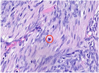 高倍镜下,细胞核呈长/短梭形或卵圆形,染色质细腻/开放,核膜光滑,可见细小核仁。胞浆嗜伊红,较丰富,核浆比尚可。偶见多形性细胞和多核细胞,偶可见核分裂象(热点区约1个/10HPF)(图1D),未见肿瘤性坏死及病理性核分裂。根据FNCLCC分级,肿瘤细胞的形态符合低级别。
