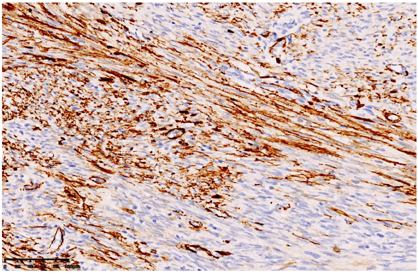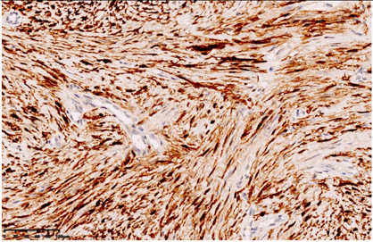 ⑤炎性肌纤维母细胞瘤:病人年龄较大且慢性炎细胞浸润不明显,肿瘤细胞表达S-100和CD34可除外IMT。