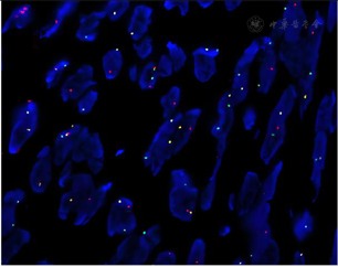 荧光原位杂交(FISH法)检测t(2p23)(ALK基因融合):阳性,即有ALK基因相关易位。(注:>70%肿瘤细胞内可见红绿分离信号,提示ALK基因发生断裂重排)(图3)